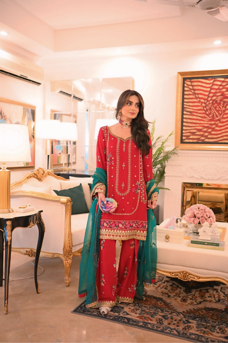 Exquisite pure raw silk 80g farshi shalwar suit paired with Kataan organza dupatta, adorned with intricate Zardosi, sequins, stones, and gotta kaamdani work. A masterpiece of hand-embellished craftsmanship.