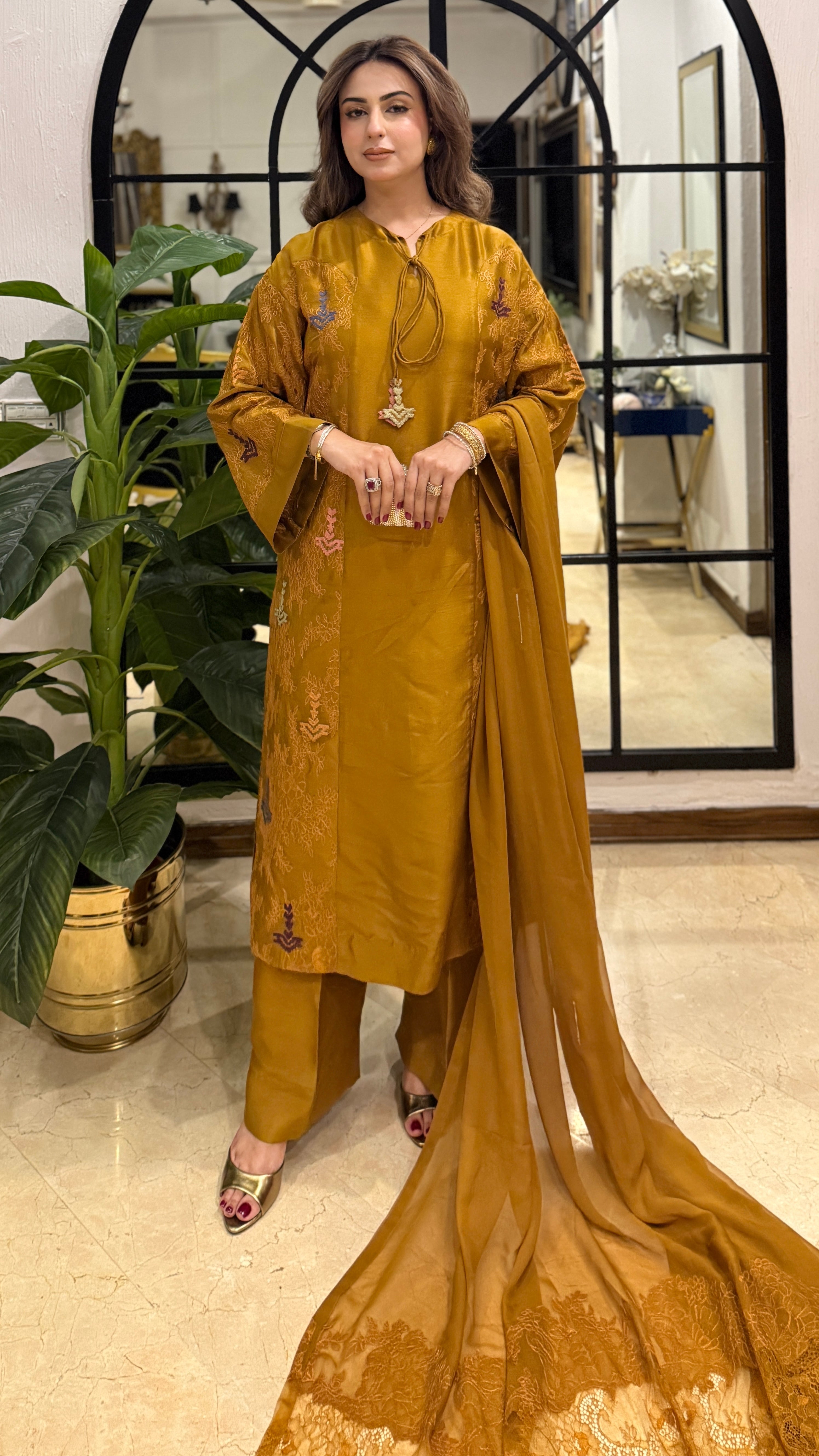 A timeless silhouette bathed in golden warmth. Delicately embroidered and effortlessly elegant, it captures the quiet luxury of dusk light, perfect for refined celebrations.