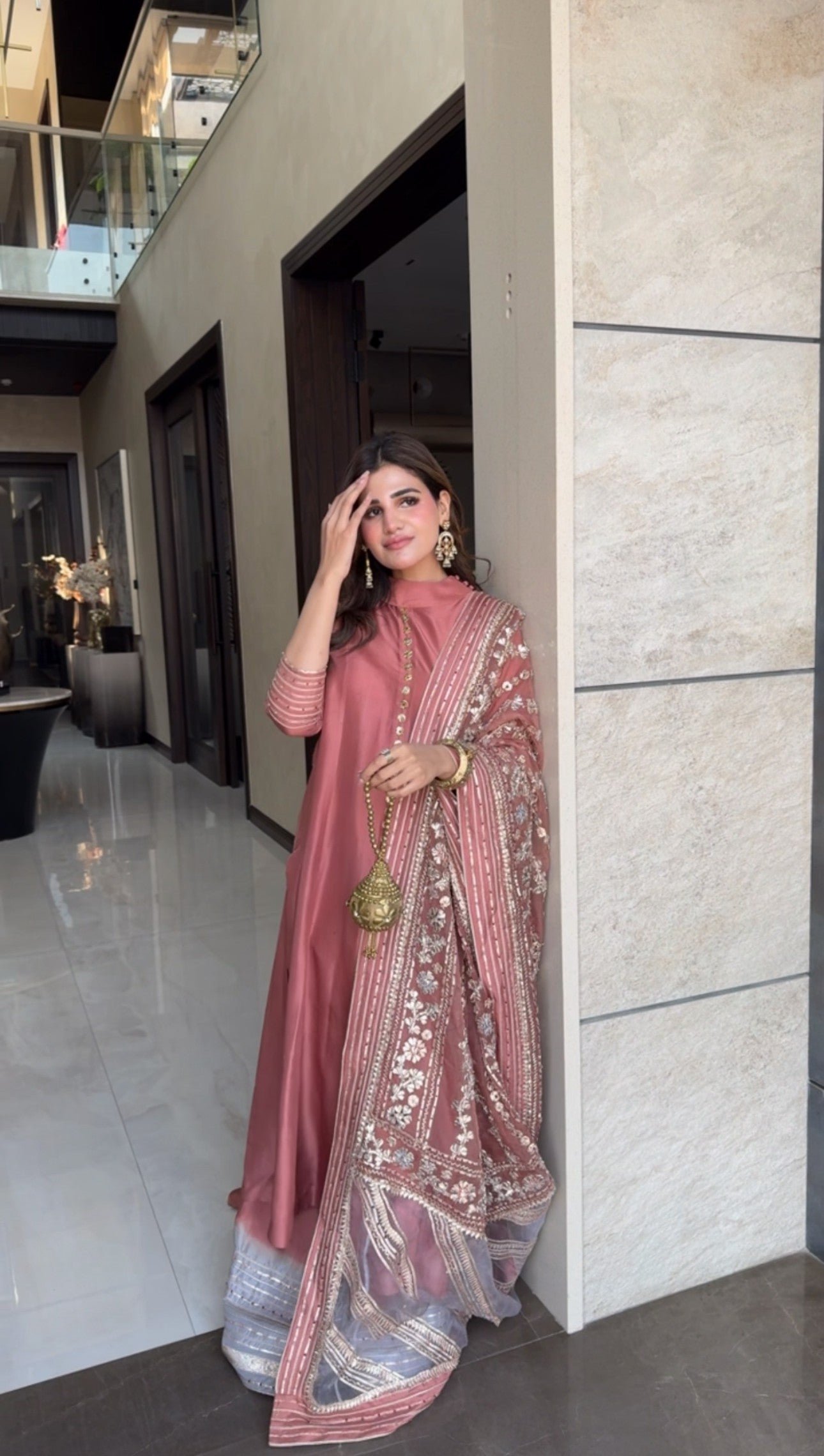 Gulnaar Royale is a luxurious wedding statement crafted from pure self-jamawar fabric, known for its rich texture and graceful drape. Paired with a single resham shawl, this ensemble is elevated through meticulous, entirely hand-done embroidery, reflecting traditional artistry and heritage craftsmanship. The intricate detailing and regal composition make it an ideal choice for wedding festivities, formal gatherings, and timeless bridal elegance.