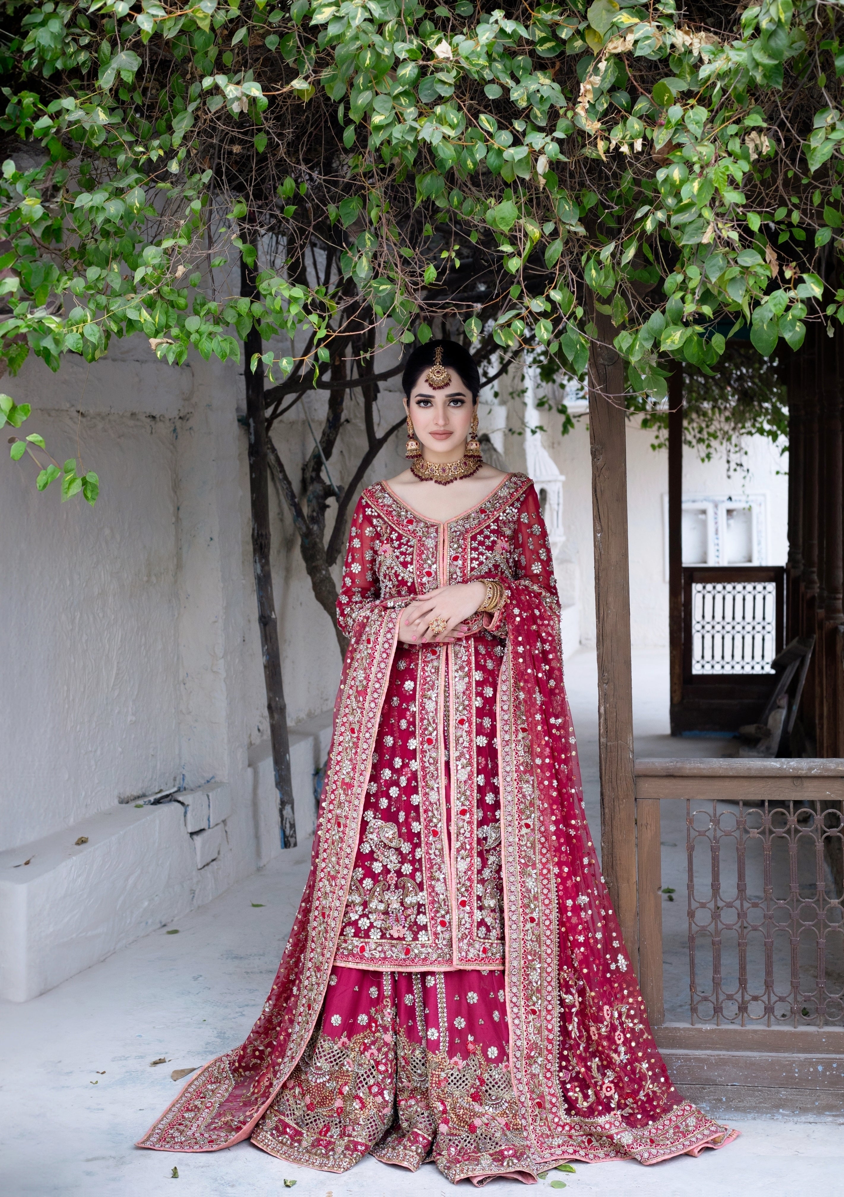 Mehr-e-Laal is a timeless bridal ensemble crafted in a deep ruby hue, adorned with intricate gold zari, sequin, and hand-embellished motifs. The richly embroidered shirt paired with a voluminous sharara and an exquisitely detailed dupatta creates a majestic silhouette, perfect for the bride who desires elegance, tradition, and grandeur on her special day.