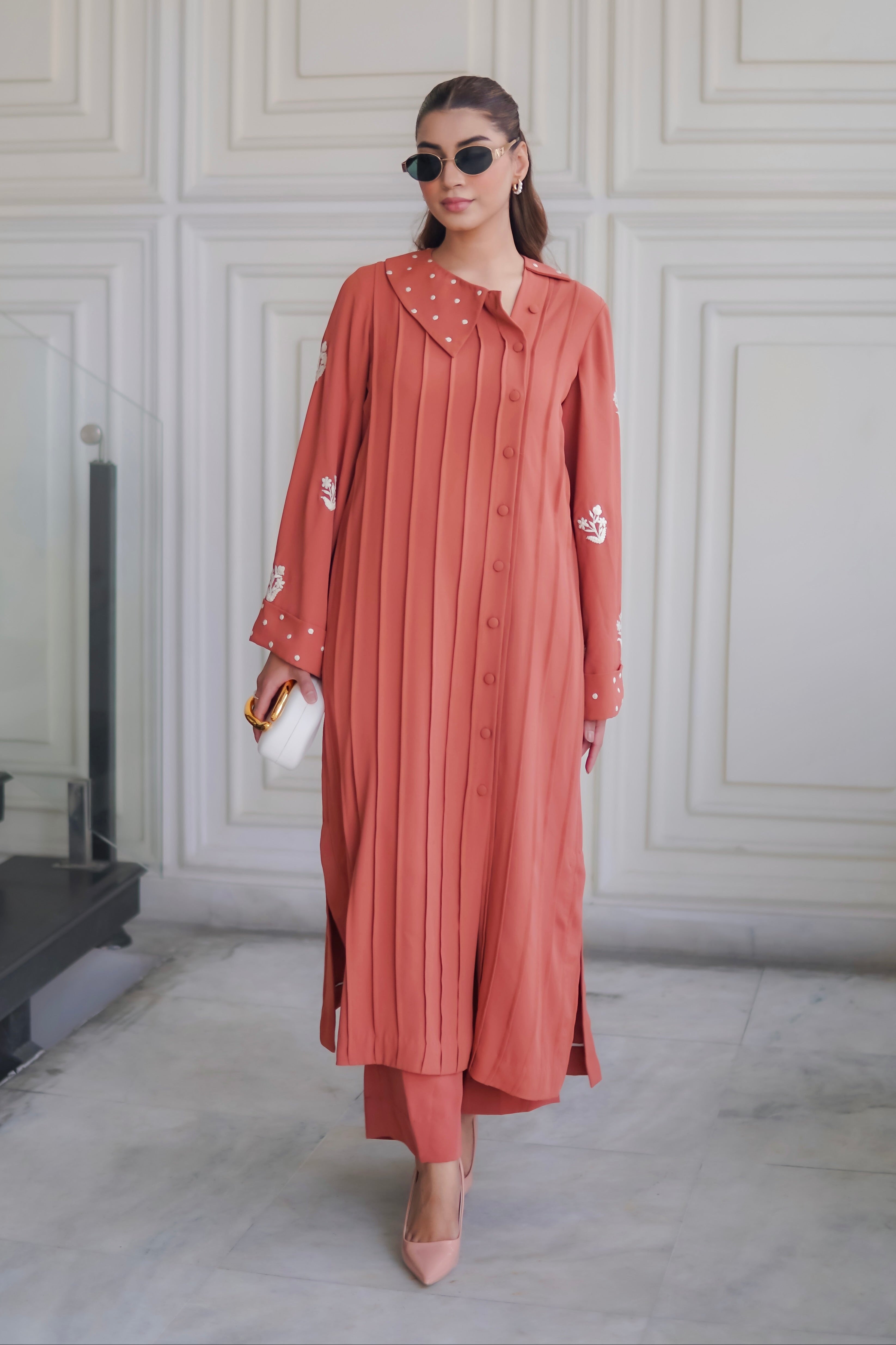 Wrap yourself in luxury this winter with our imported thick fabric flowy, comfortable, and effortlessly chic. Designed to keep you modern and cozy, it's perfect for layering with shawls and scarves. Ideal for working ladies on-the-go! We add intricate embroidery to the sleeves, bringing a touch of sophistication to your winter look.