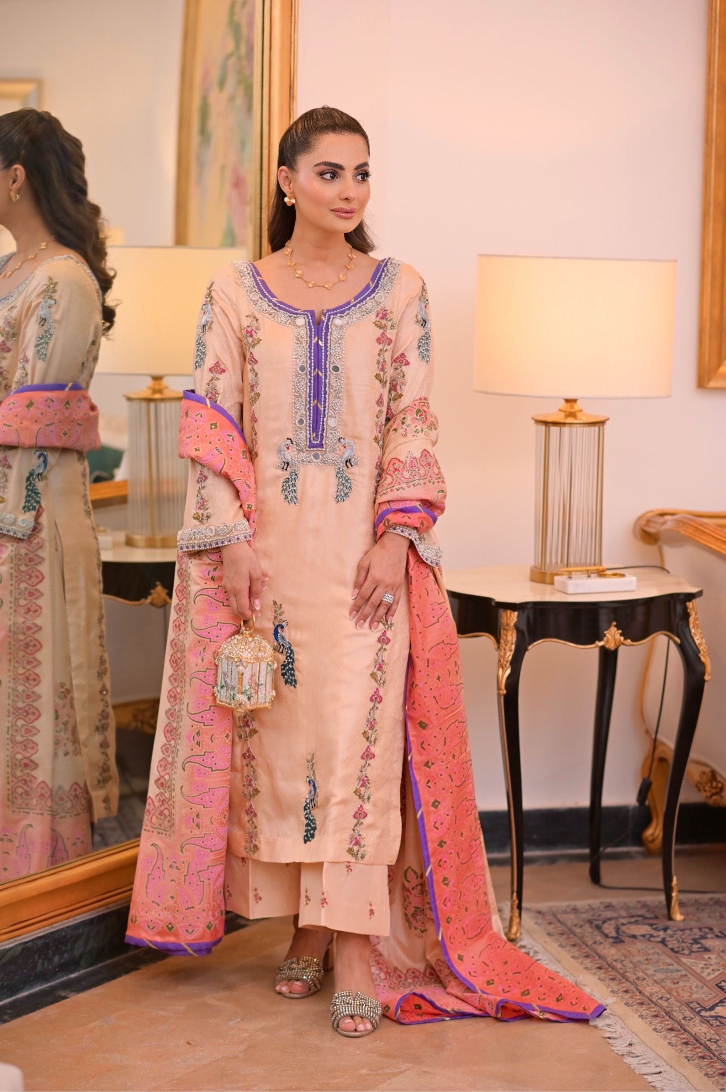 Featuring a stunning pure self-jamawar soft fabric shawl and shirt paired with pure raw silk 80g trousers. The outfit is intricately hand-embroidered with a beautiful peacock design, adding a touch of elegance and sophistication. Perfect for special occasions!"