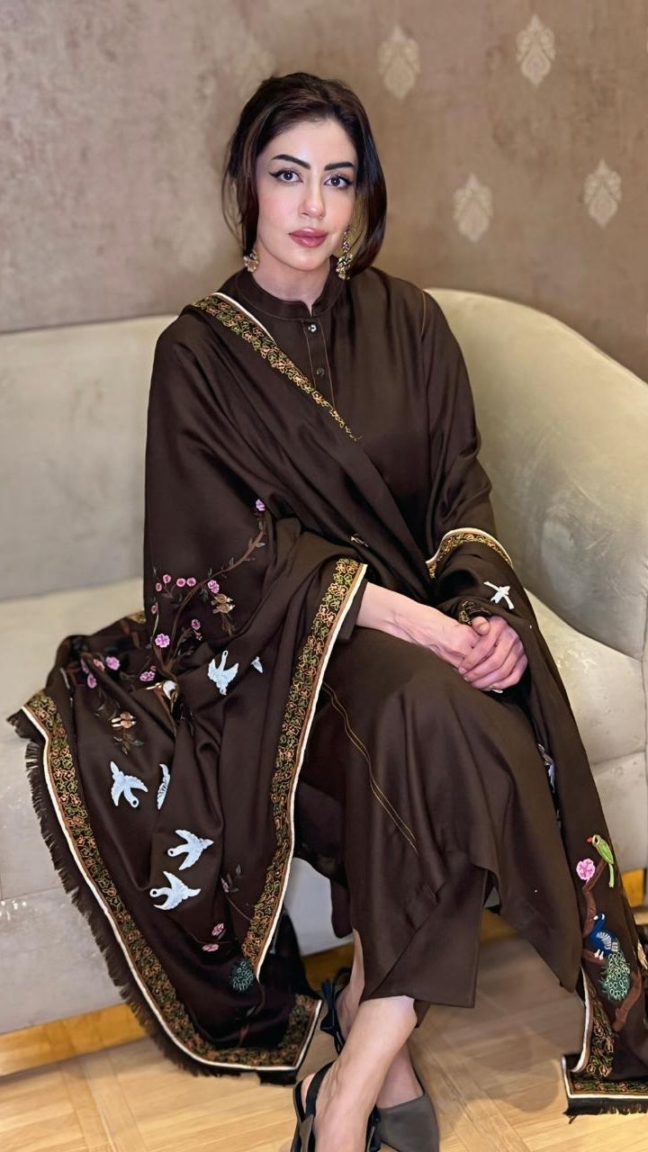 Story of birds is a timeless winter ensemble crafted in a deep cocoa-brown hue, exuding understated luxury. Featuring a structured silhouette with minimal front detailing, the look is elevated by a beautifully embroidered shawl adorned with delicate floral motifs and ornate borders. Designed for warmth and grace, this outfit is perfect for winter evenings, intimate gatherings, and sophisticated daytime wear.