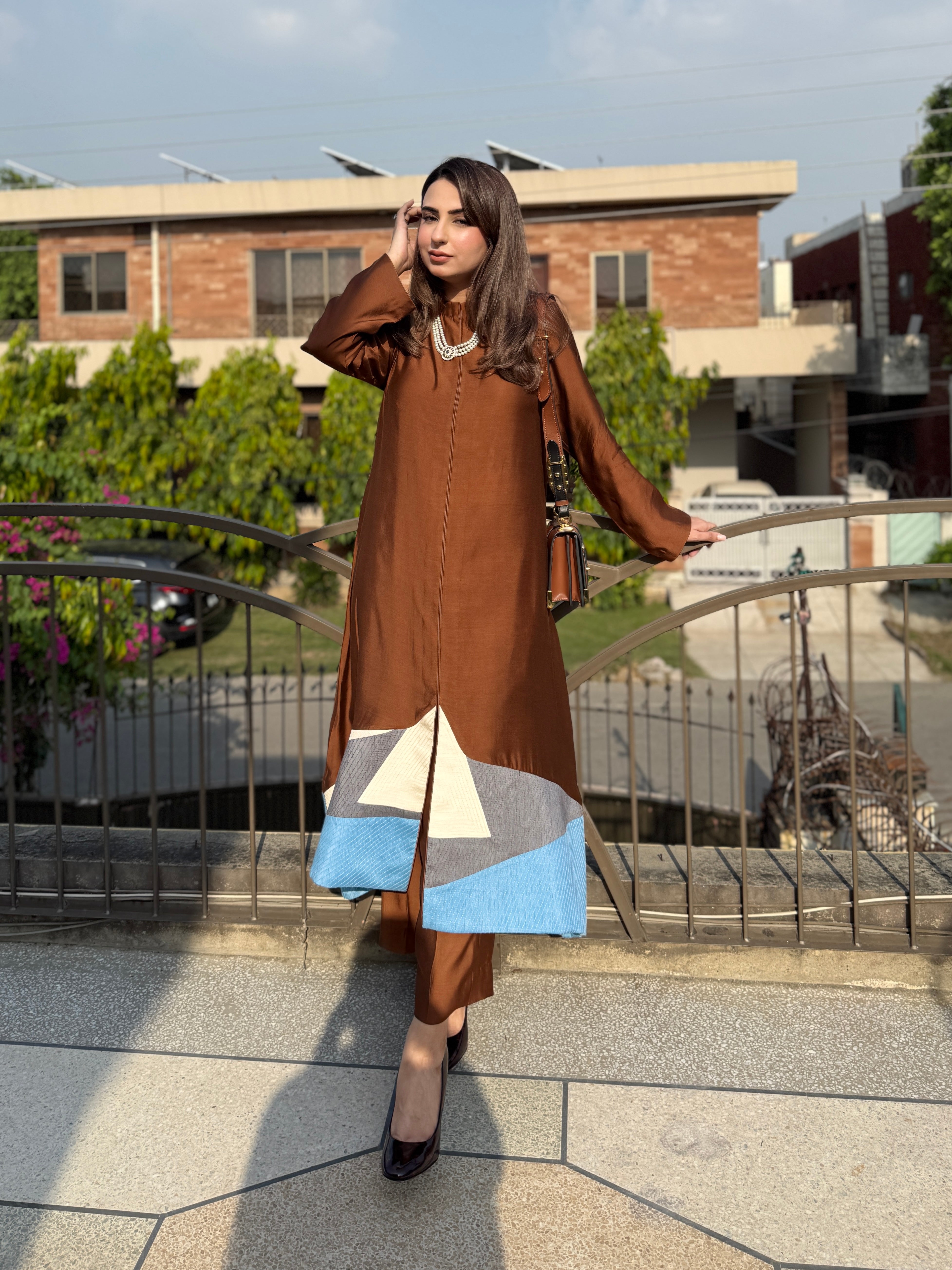 a contemporary co-ord set crafted in rich earthy tones, accented with geometric panels in serene blue and beige. Designed for the modern woman who values understated sophistication and effortless style.