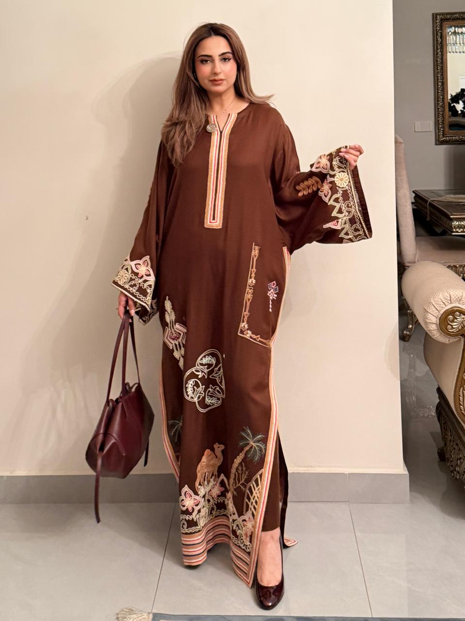Crafted for winter elegance, Zamrud-e-Shaam is a rich chocolate-brown long dress featuring intricate embroidery inspired by timeless heritage motifs. The relaxed silhouette, wide embroidered sleeves, and detailed borders offer warmth without compromising style. Perfect for winter gatherings, evening wear, or elevated casual looks, this piece blends tradition with contemporary sophistication.